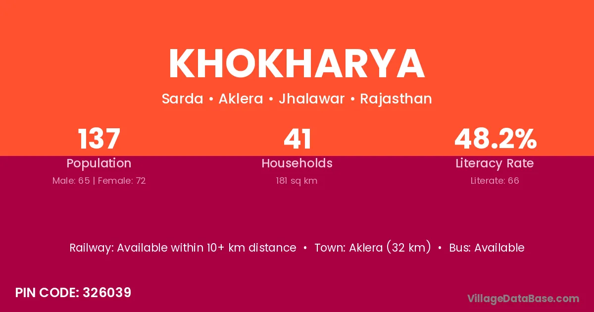 Aklera (32 km) is the nearest town to Khokharya village for major economic activities and is located approximately 32 km away.