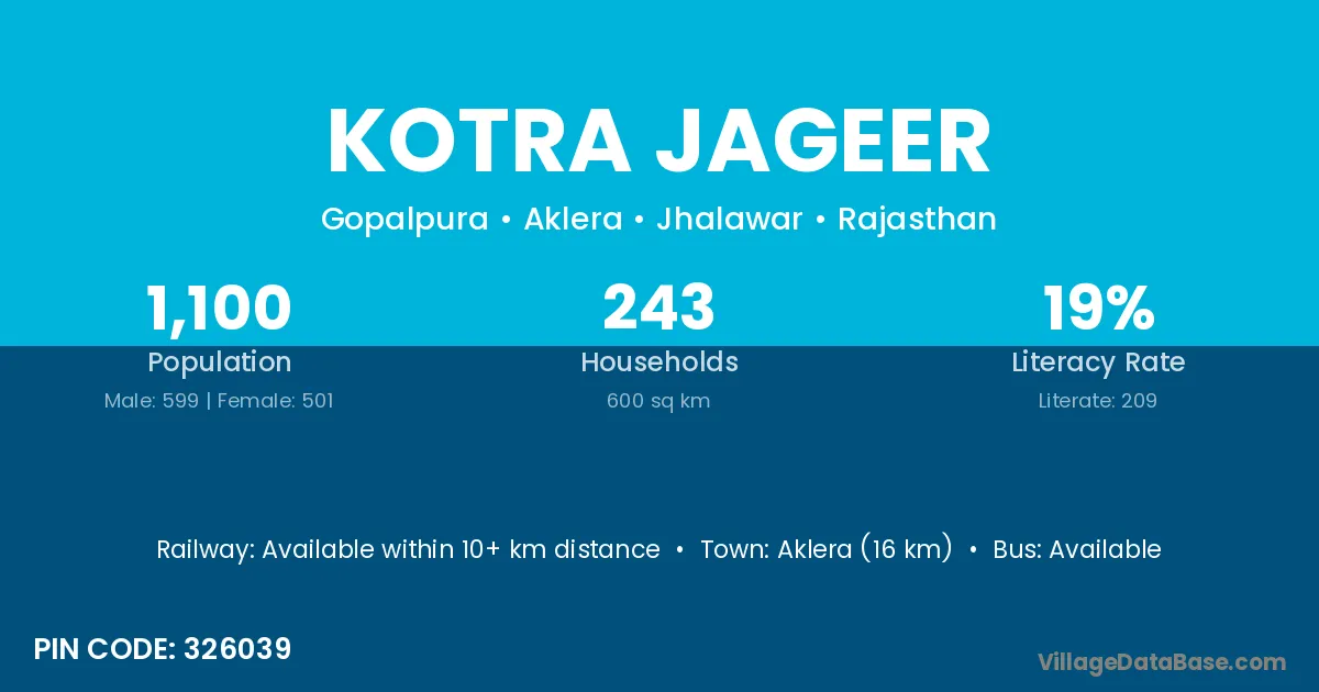 Aklera (16 km) is the nearest town to Kotra Jageer village for major economic activities and is located approximately 16 km away.