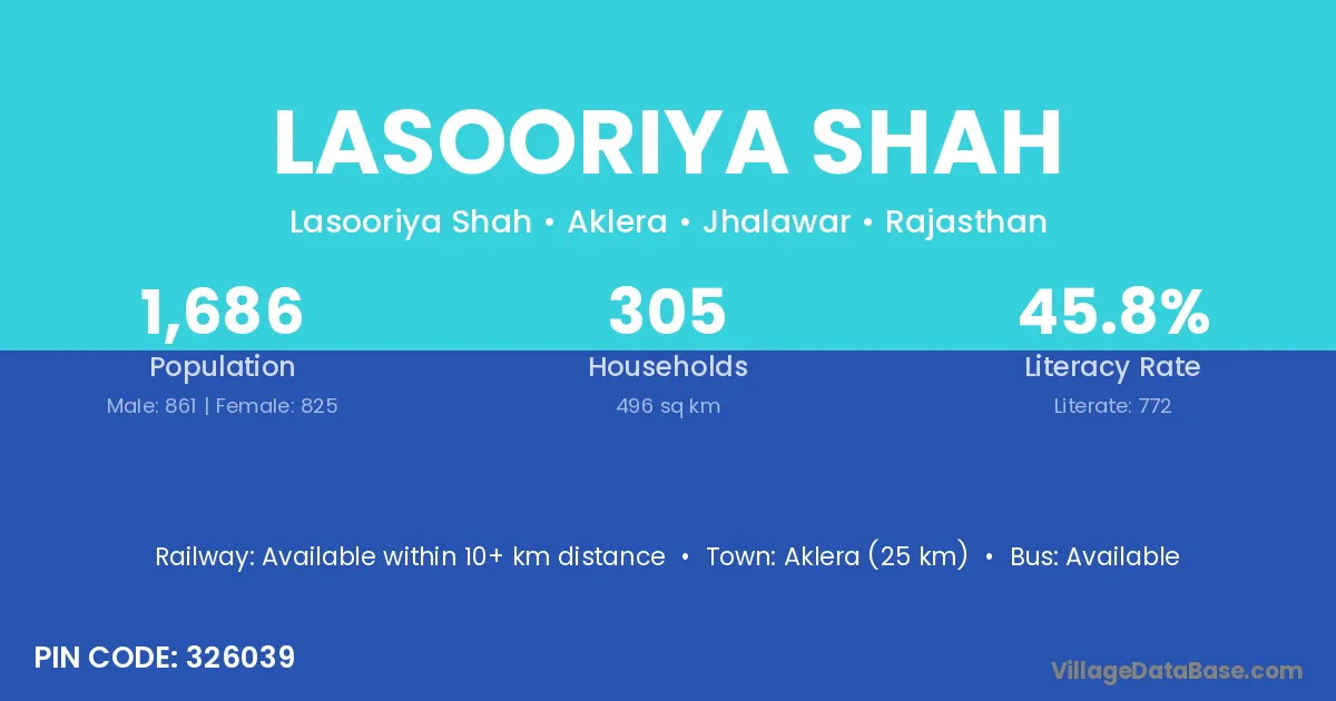Aklera (25 km) is the nearest town to Lasooriya Shah village for major economic activities and is located approximately 25 km away.