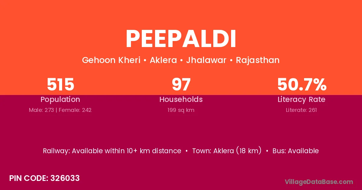 Aklera (18 km) is the nearest town to Peepaldi village for major economic activities and is located approximately 18 km away.
