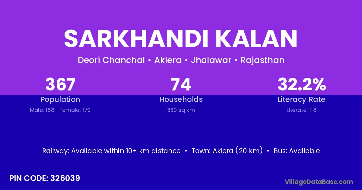 Aklera (20 km) is the nearest town to Sarkhandi Kalan village for major economic activities and is located approximately 20 km away.