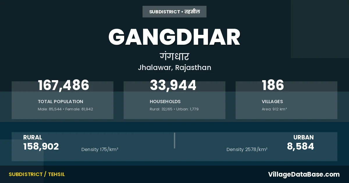 According to the 2011 census The total area of Gangdhar Tehsil is 912 km², with a population of 167486 people. The population density is 184 inhabitants per square kilometre, and there are approximately 33944 houses in the sub district.