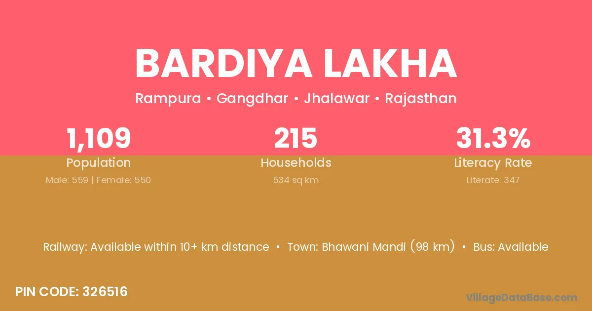 Bardiya Lakha village has a total population of 1,109 people, of which 559 are males and 550 are females.