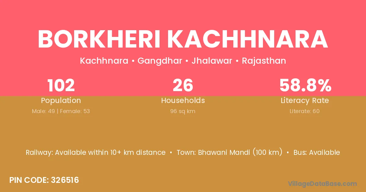 Bhawani Mandi (100 km) is the nearest town to Borkheri Kachhnara village for major economic activities and is located approximately 100 km away.