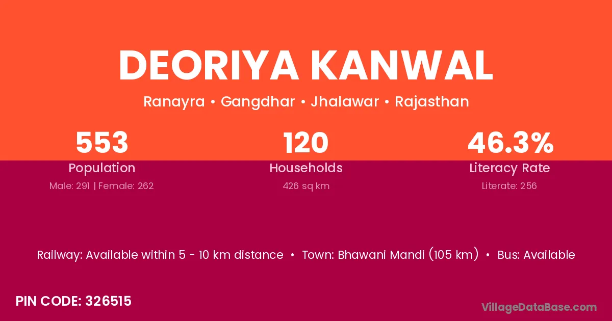 Bhawani Mandi (105 km) is the nearest town to Deoriya Kanwal village for major economic activities and is located approximately 105 km away.
