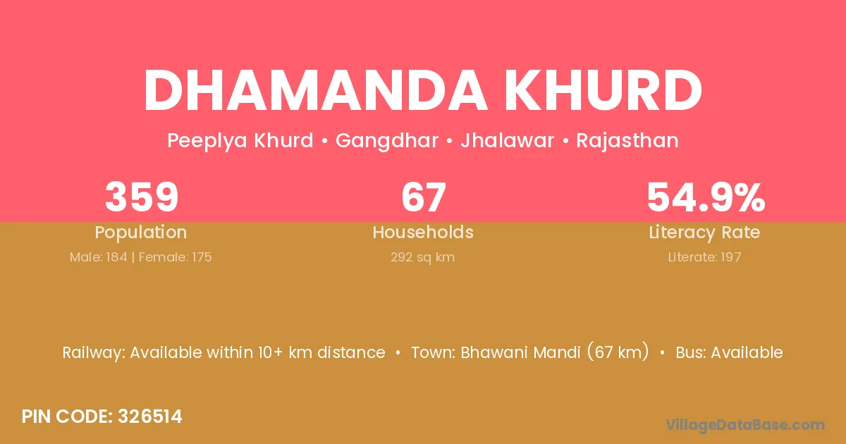 Bhawani Mandi (67 km) is the nearest town to Dhamanda Khurd village for major economic activities and is located approximately 67 km away.