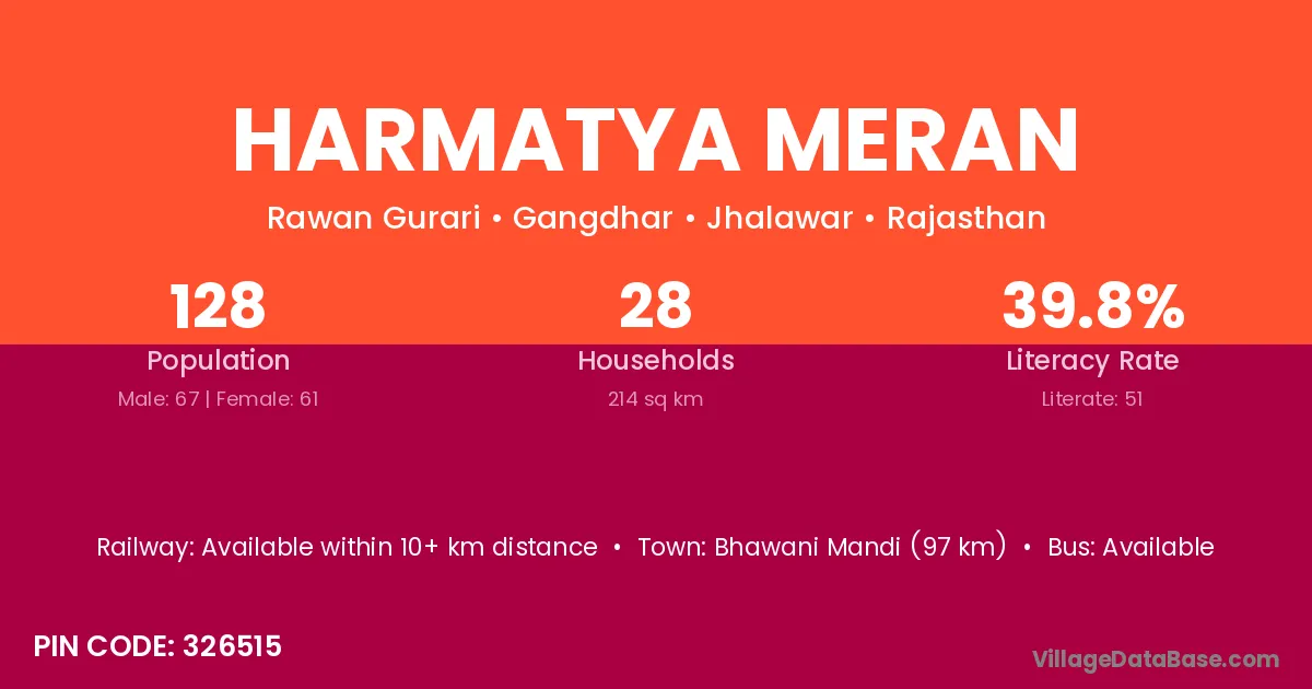 Bhawani Mandi (97 km) is the nearest town to Harmatya Meran village for major economic activities and is located approximately 97 km away.