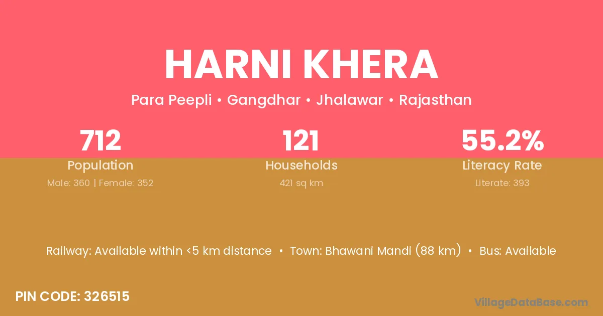 Bhawani Mandi (88 km) is the nearest town to Harni Khera village for major economic activities and is located approximately 88 km away.