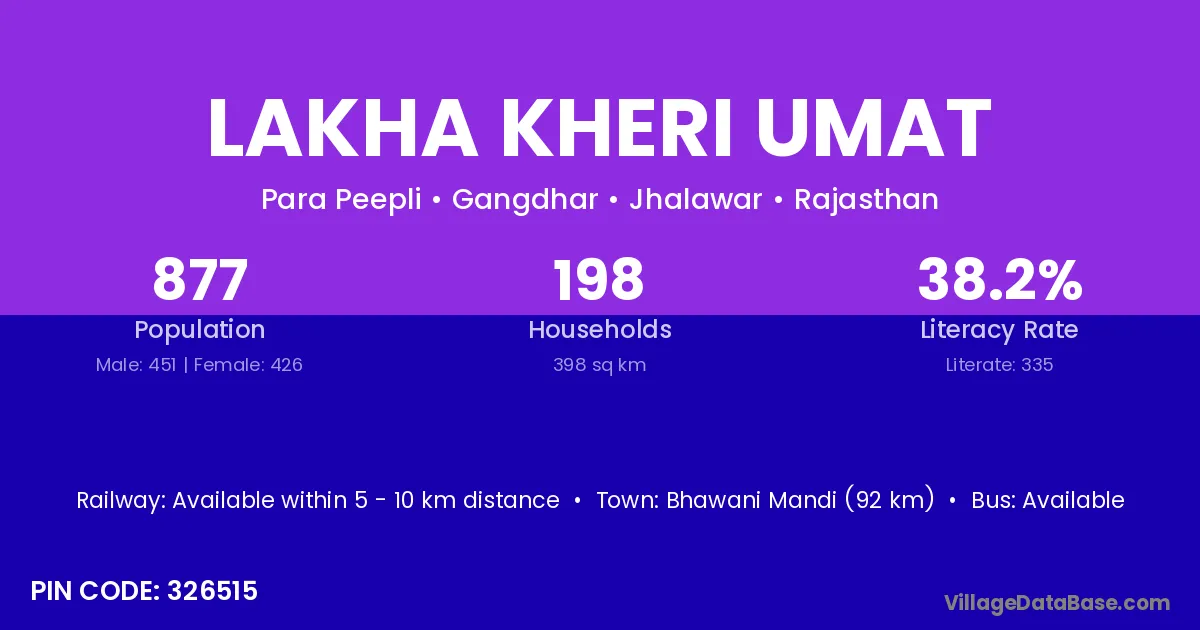 Lakha Kheri Umat village has a total population of 877 people, of which 451 are males and 426 are females.