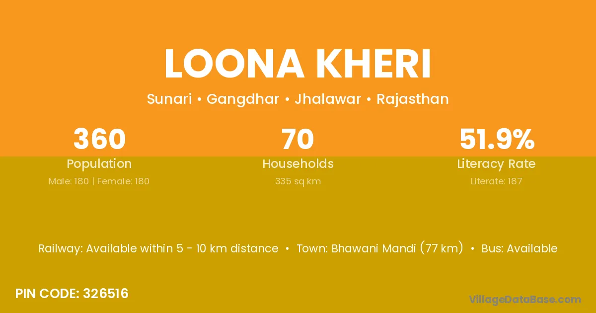 Loona Kheri village has a total population of 360 people, of which 180 are males and 180 are females.