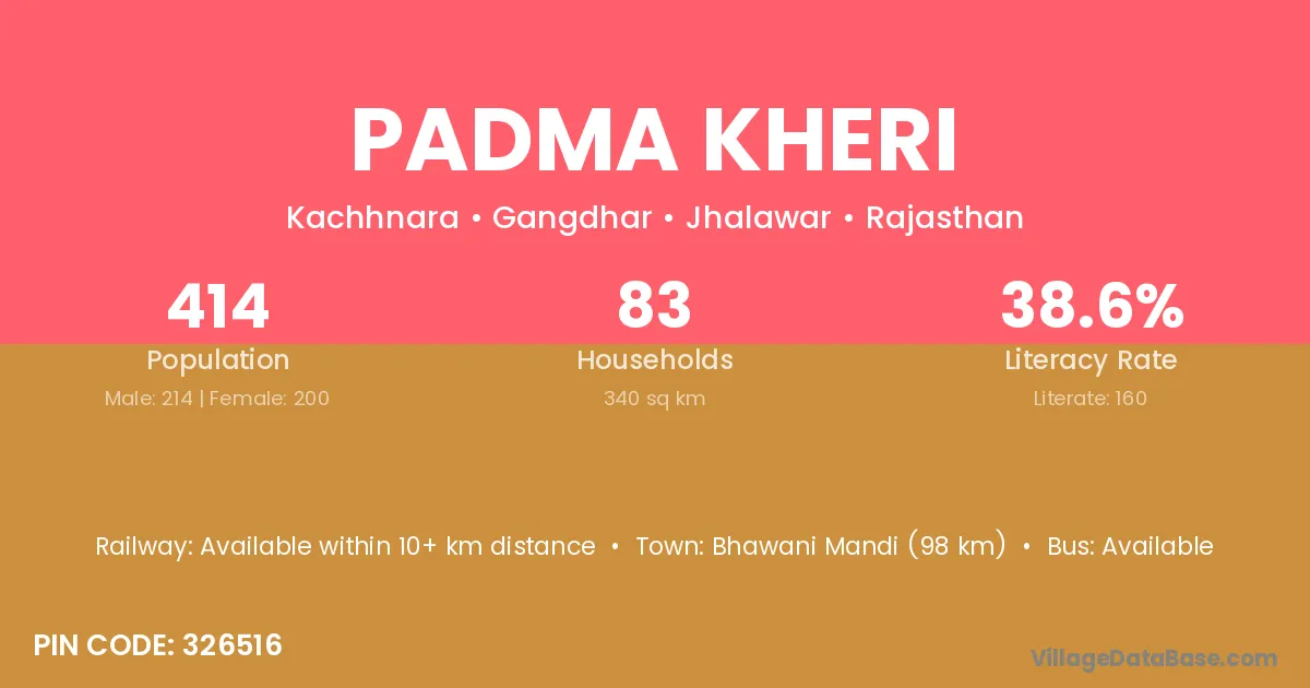 Bhawani Mandi (98 km) is the nearest town to Padma Kheri village for major economic activities and is located approximately 98 km away.