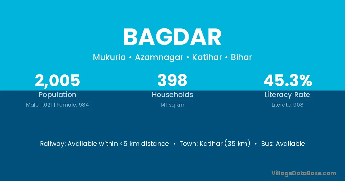 The literacy rate of Bagdar village is 41.85%. Male literacy stands at 49.23% and female literacy at 32.92%.