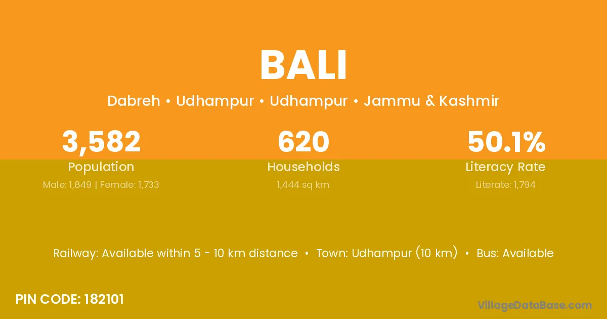 The literacy rate of Bali village is 41.28%. Male literacy stands at 61.50% and female literacy at 20.23%.