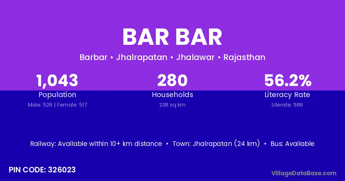 Jhalrapatan (24 km) is the nearest town to Bar Bar village for major economic activities and is located approximately 24 km away.