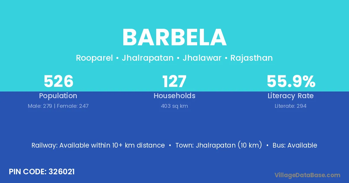 Jhalrapatan (10 km) is the nearest town to Barbela village for major economic activities and is located approximately 10 km away.