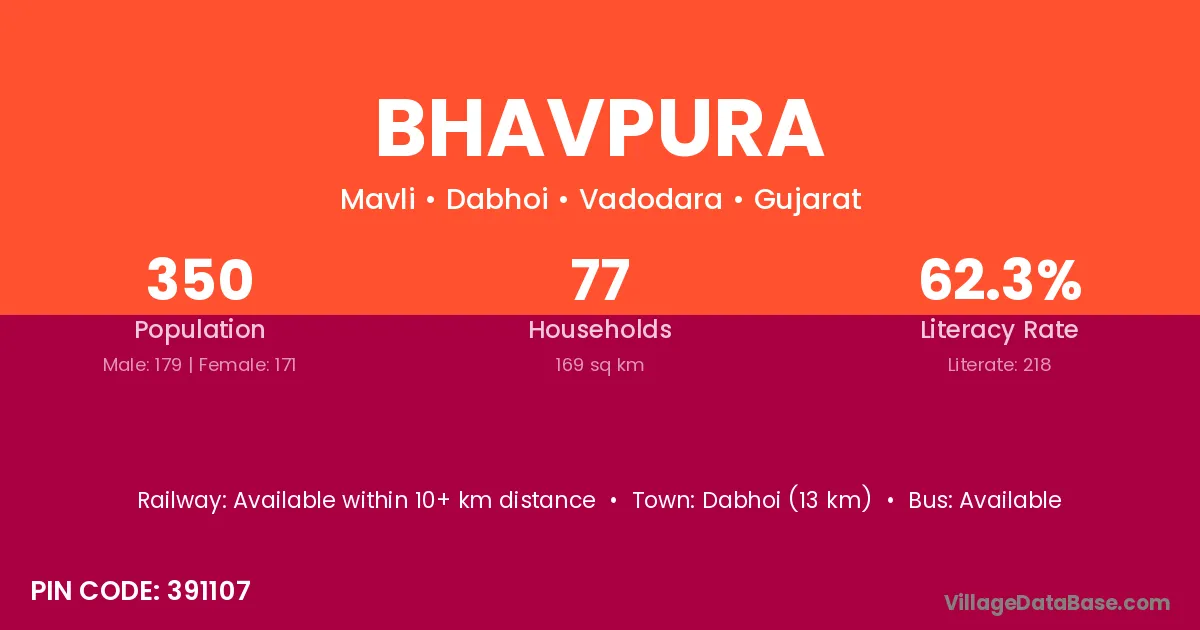The literacy rate of Bhavpura village is 62.89%. Male literacy stands at 78.36% and female literacy at 44.90%.