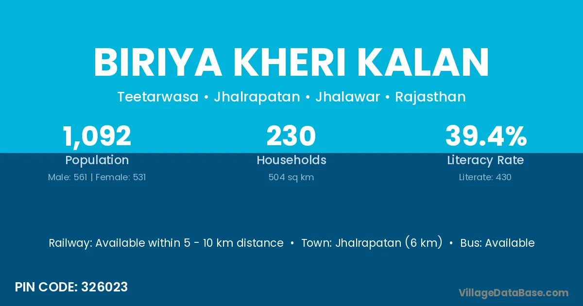 Jhalrapatan (6 km) is the nearest town to Biriya Kheri Kalan village for major economic activities and is located approximately 6 km away.