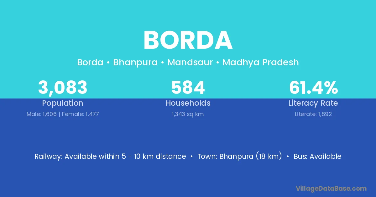 Jhalrapatan (13 km) is the nearest town to Borda village for major economic activities and is located approximately 13 km away.
