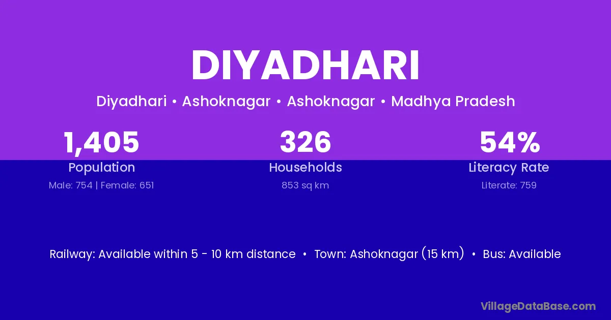 Jhalrapatan (44 km) is the nearest town to Diyadhari village for major economic activities and is located approximately 44 km away.