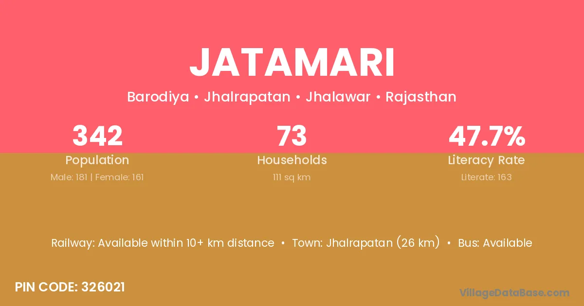 Jhalrapatan (26 km) is the nearest town to Jatamari village for major economic activities and is located approximately 26 km away.