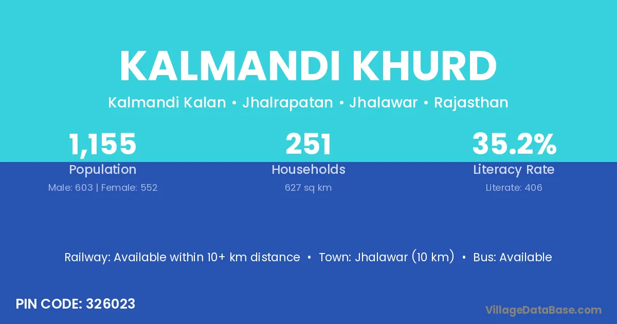 Jhalawar (10 km) is the nearest town to Kalmandi Khurd village for major economic activities and is located approximately 10 km away.