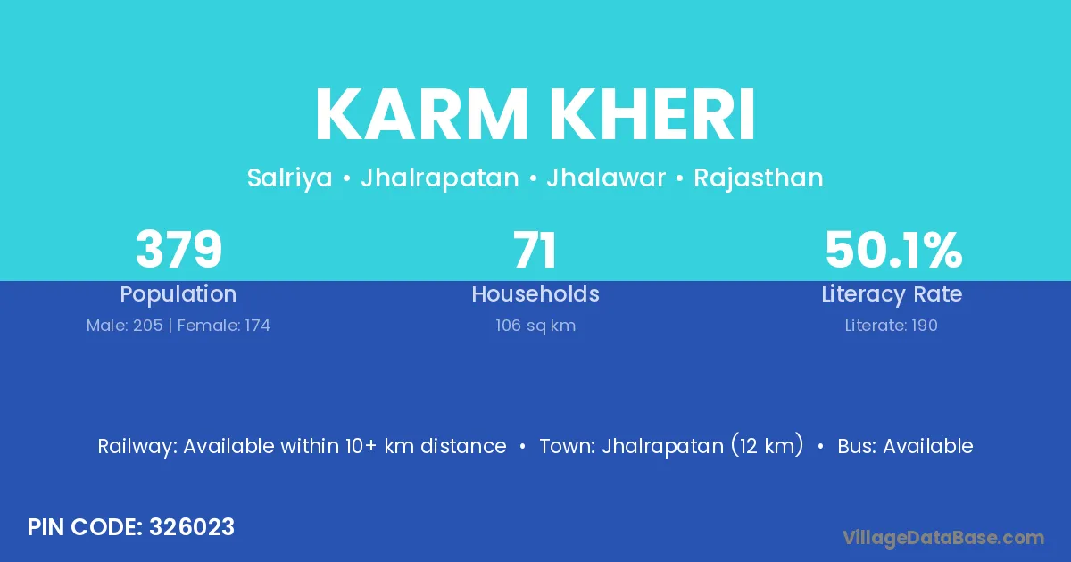 Jhalrapatan (12 km) is the nearest town to Karm Kheri village for major economic activities and is located approximately 12 km away.