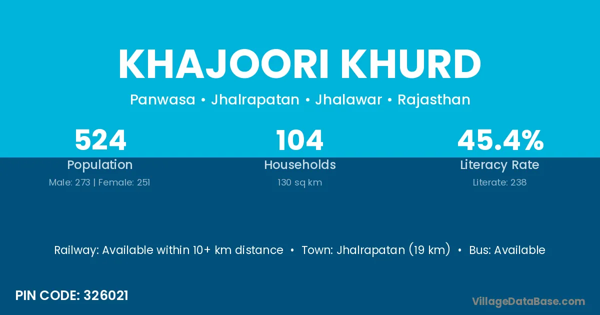 Jhalrapatan (19 km) is the nearest town to Khajoori Khurd village for major economic activities and is located approximately 19 km away.