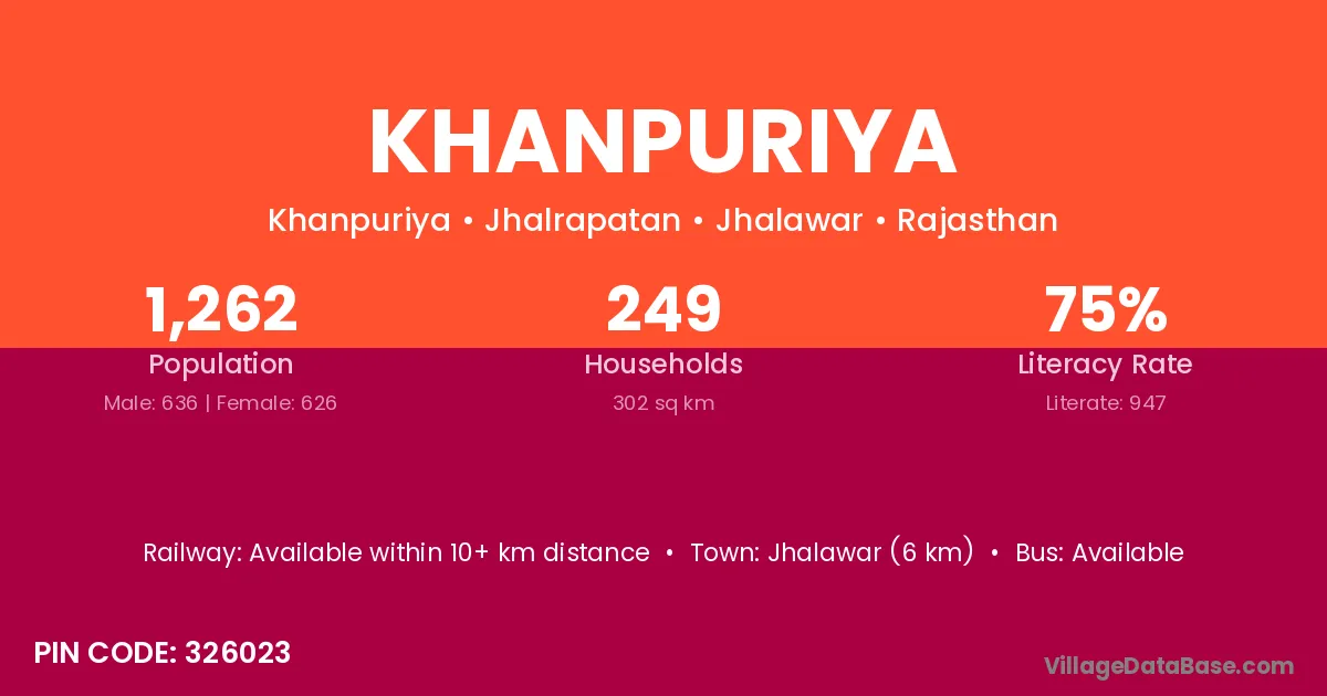 Khanpuriya village has a total population of 1,262 people, of which 636 are males and 626 are females.