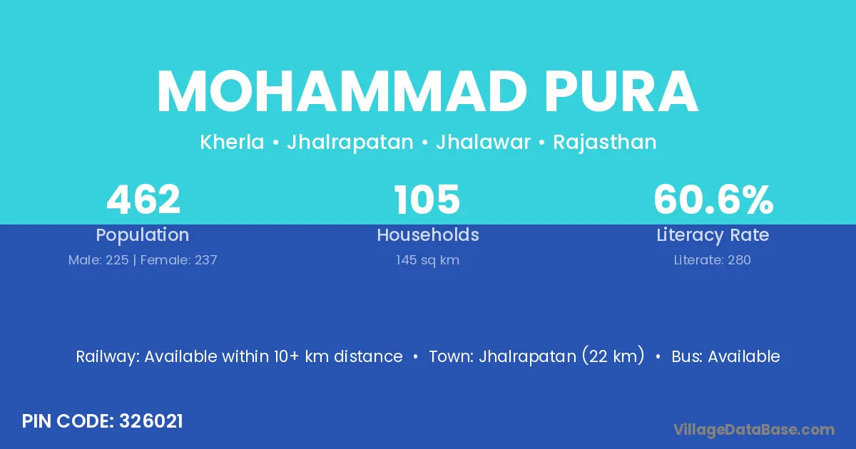 Jhalrapatan (22 km) is the nearest town to Mohammad Pura village for major economic activities and is located approximately 22 km away.
