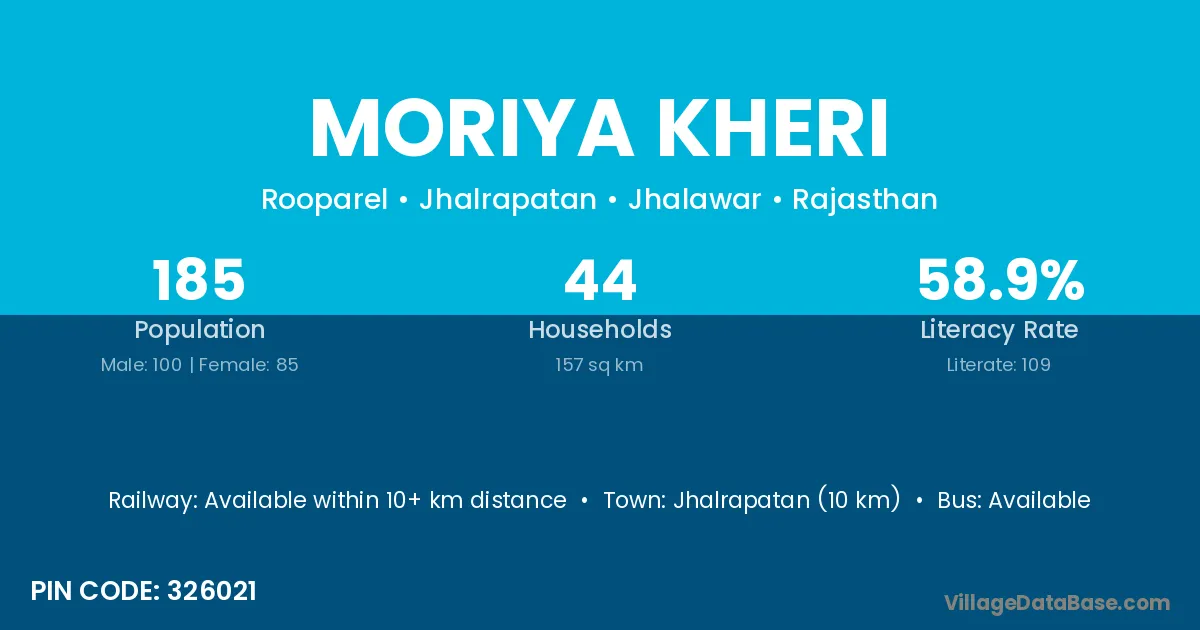 Jhalrapatan (10 km) is the nearest town to Moriya Kheri village for major economic activities and is located approximately 10 km away.