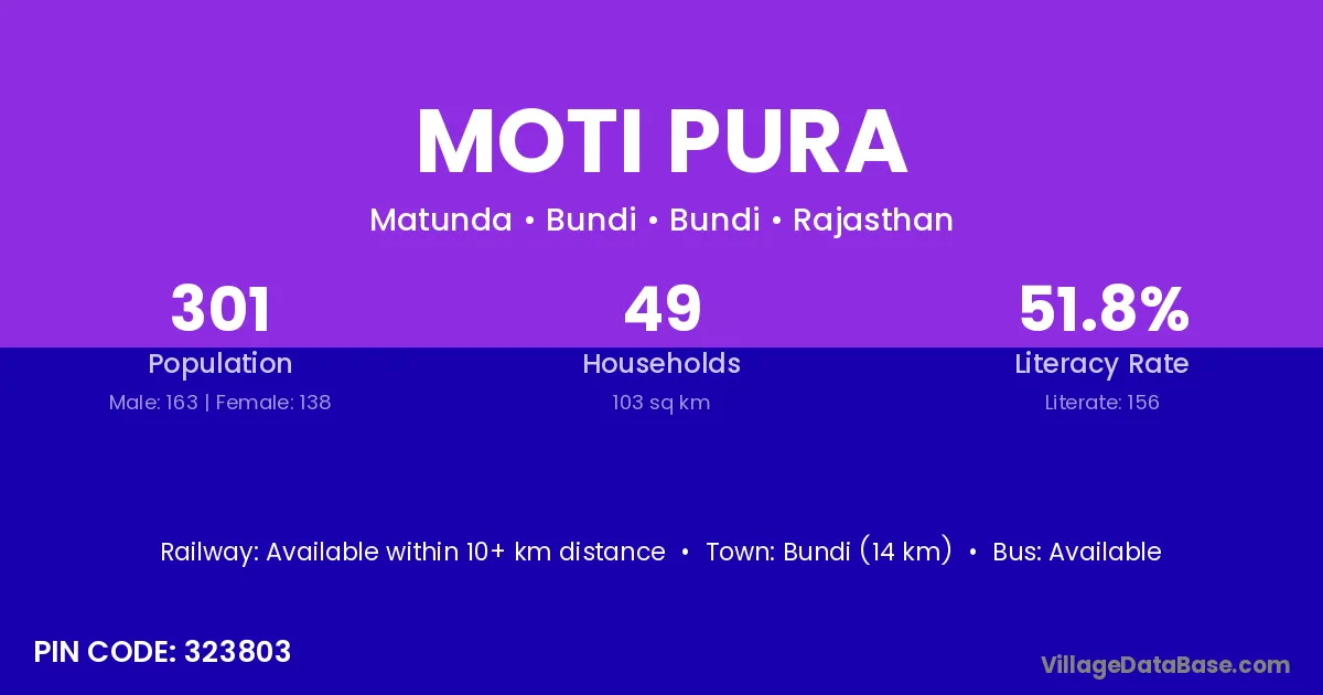 According to Census 2011 information, the village code of Moti Pura village is 326501.