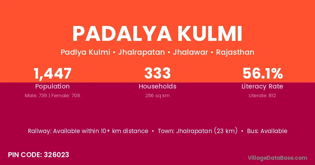 Jhalrapatan (23 km) is the nearest town to Padalya Kulmi village for major economic activities and is located approximately 23 km away.