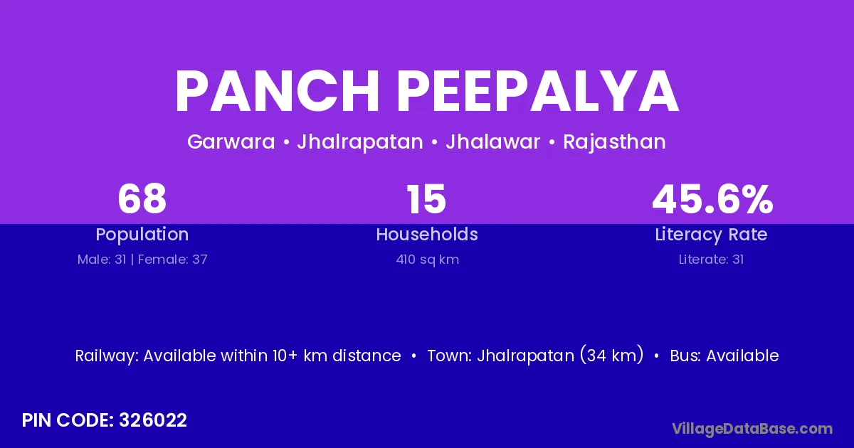 Jhalrapatan (34 km) is the nearest town to Panch Peepalya village for major economic activities and is located approximately 34 km away.