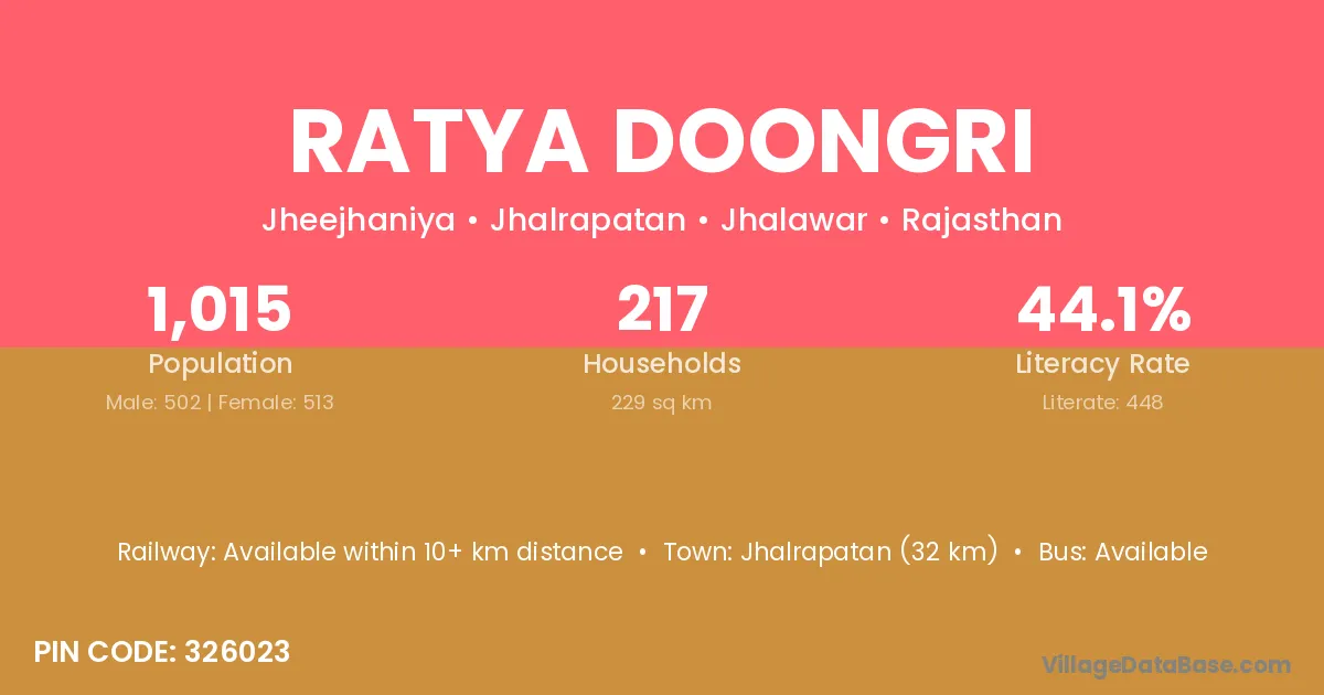 Jhalrapatan (32 km) is the nearest town to Ratya Doongri village for major economic activities and is located approximately 32 km away.