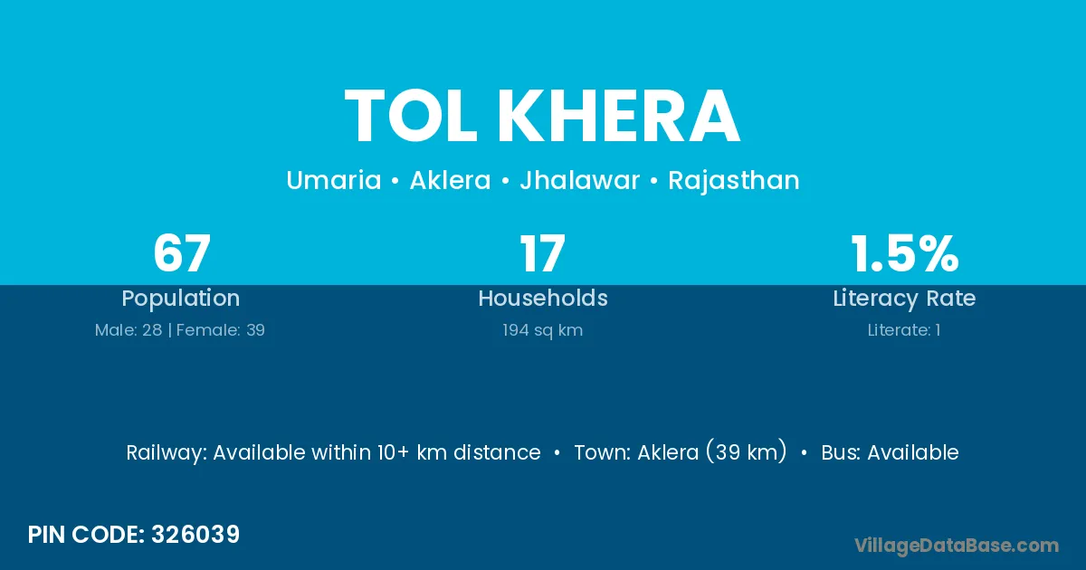 Jhalrapatan (13 km) is the nearest town to Tol Khera village for major economic activities and is located approximately 13 km away.