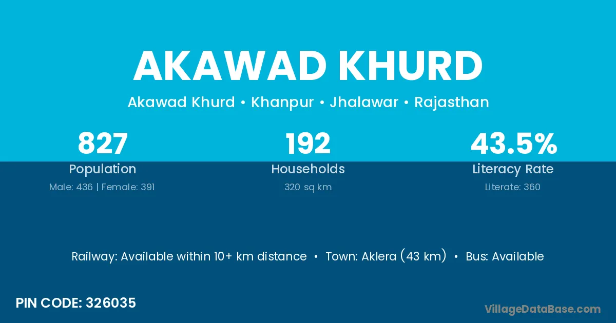 Aklera (43 km) is the nearest town to Akawad Khurd village for major economic activities and is located approximately 43 km away.