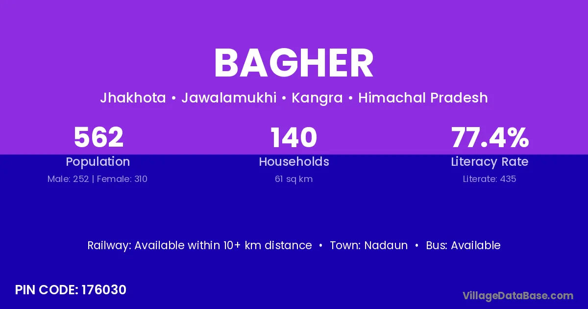 According to Census 2011 information, the village code of Bagher village is 326001.