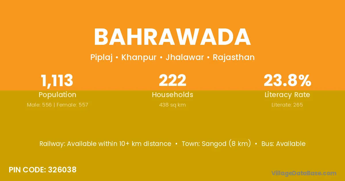 Sangod (8 km) is the nearest town to Bahrawada village for major economic activities and is located approximately 8 km away.