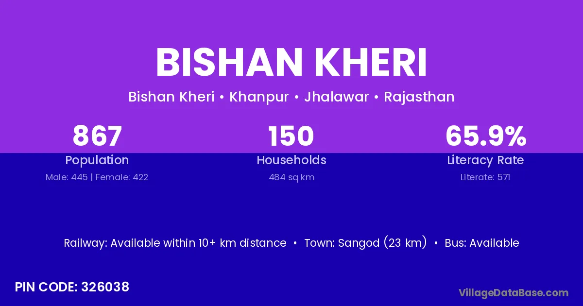 Sangod (23 km) is the nearest town to Bishan Kheri village for major economic activities and is located approximately 23 km away.