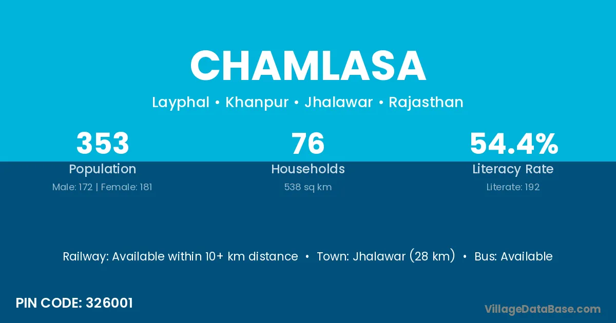 Jhalawar (28 km) is the nearest town to Chamlasa village for major economic activities and is located approximately 28 km away.