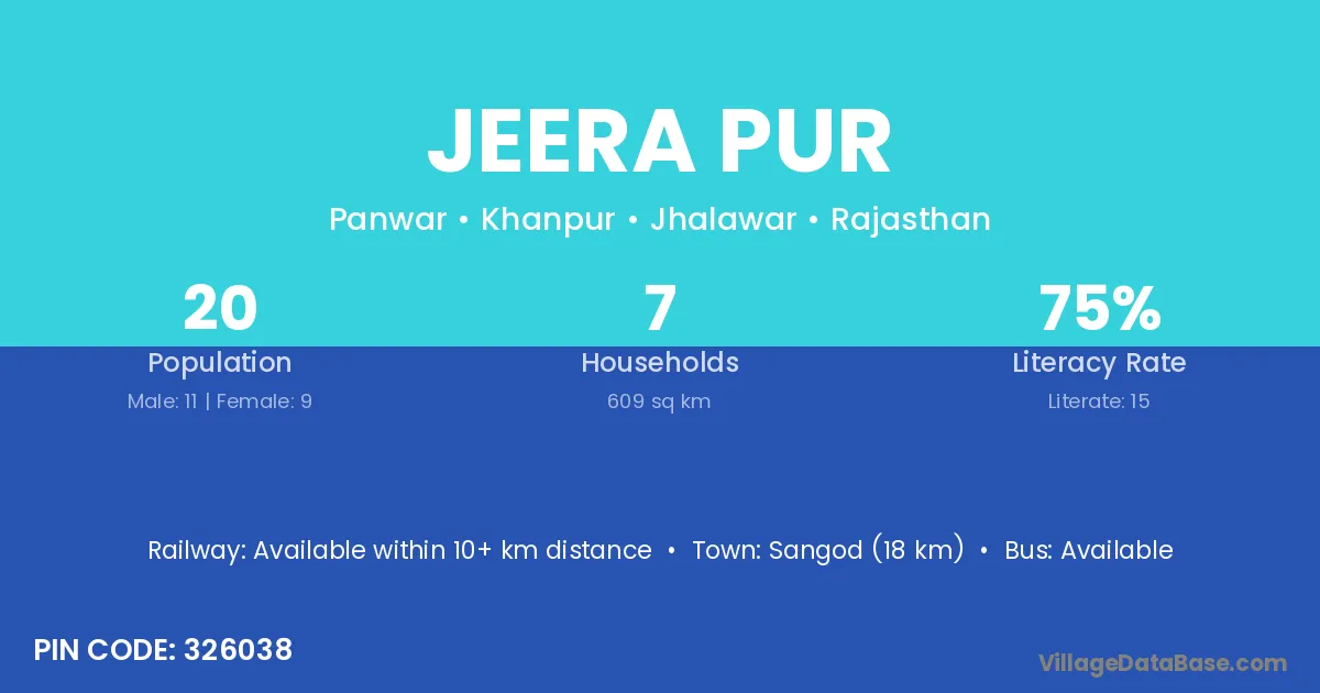 Sangod (18 km) is the nearest town to Jeera Pur village for major economic activities and is located approximately 18 km away.
