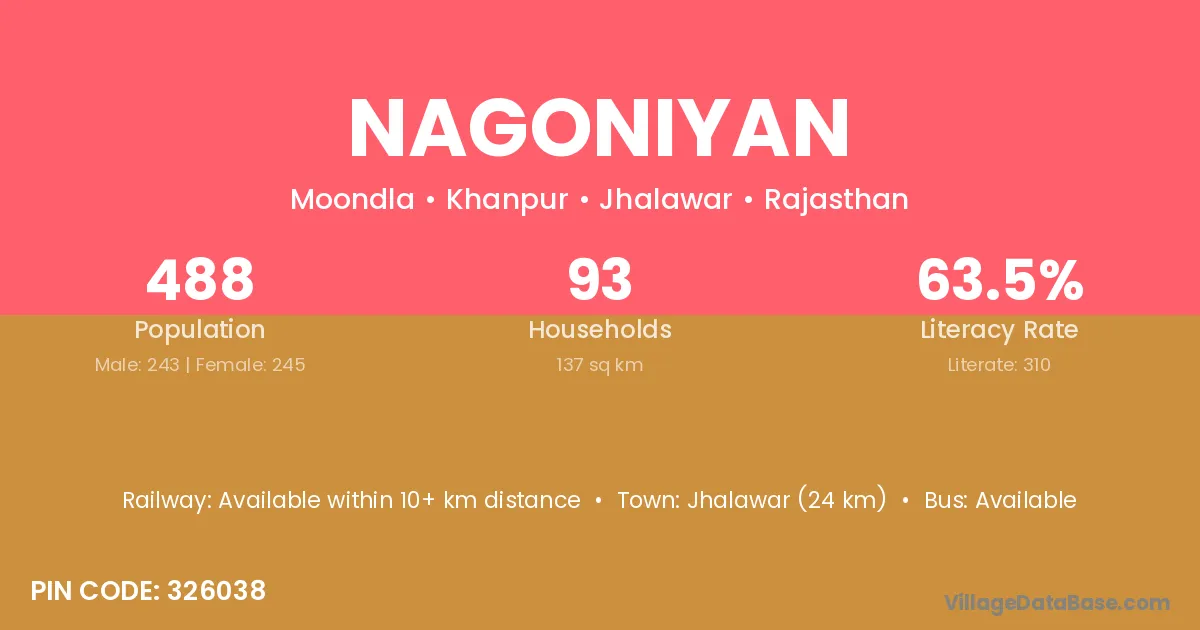Jhalawar (24 km) is the nearest town to Nagoniyan village for major economic activities and is located approximately 24 km away.