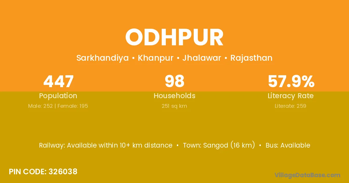 Sangod (16 km) is the nearest town to Odhpur village for major economic activities and is located approximately 16 km away.