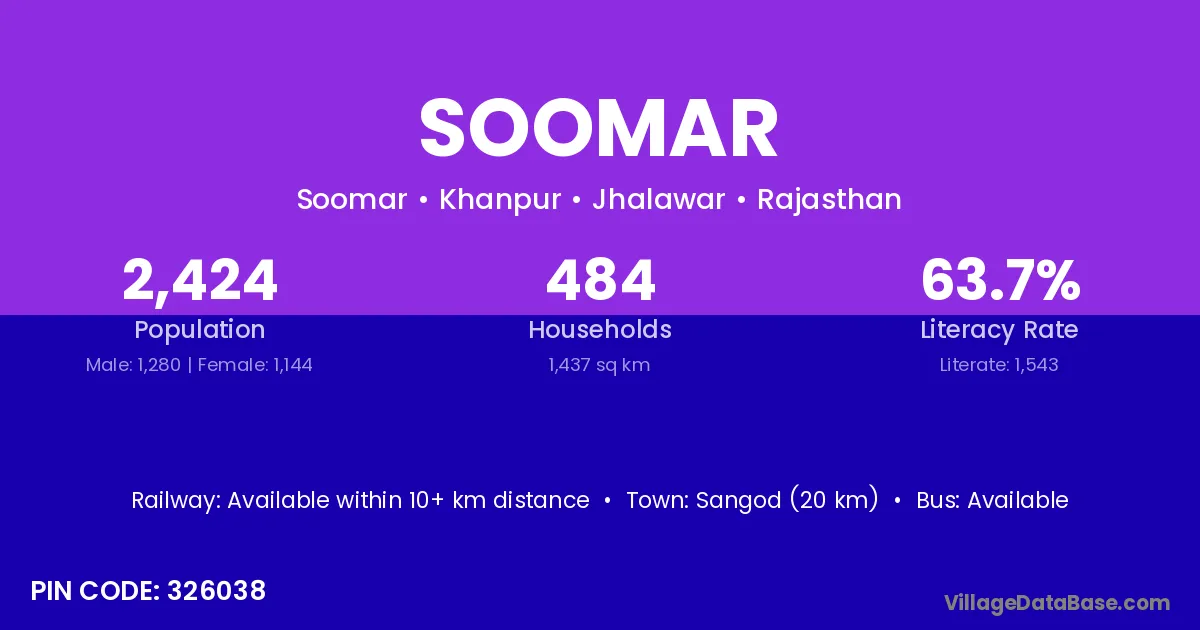Sangod (20 km) is the nearest town to Soomar village for major economic activities and is located approximately 20 km away.