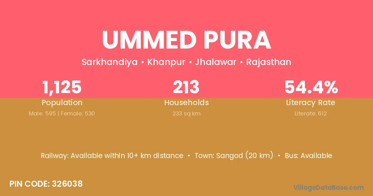 Sangod (20 km) is the nearest town to Ummed Pura village for major economic activities and is located approximately 20 km away.