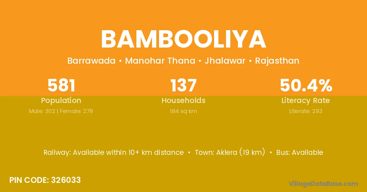 Aklera (19 km) is the nearest town to Bambooliya village for major economic activities and is located approximately 19 km away.