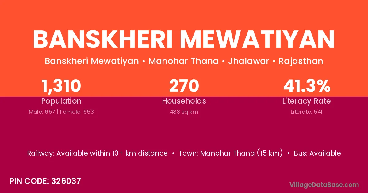 Banskheri Mewatiyan village has a total population of 1,310 people, of which 657 are males and 653 are females.