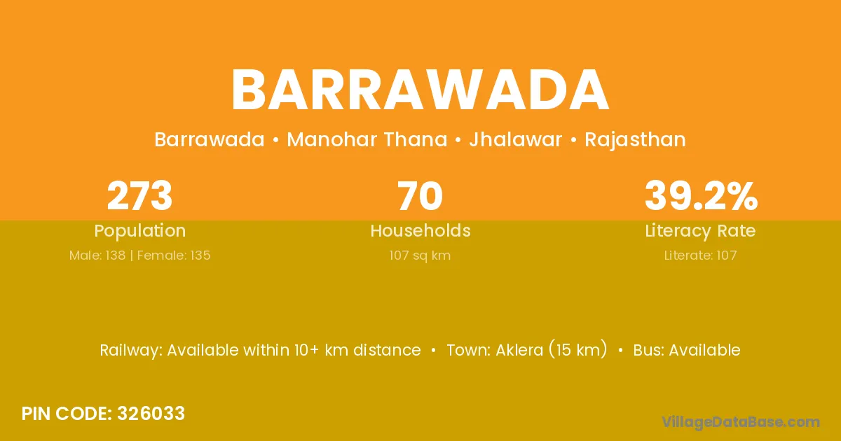 Aklera (15 km) is the nearest town to Barrawada village for major economic activities and is located approximately 15 km away.