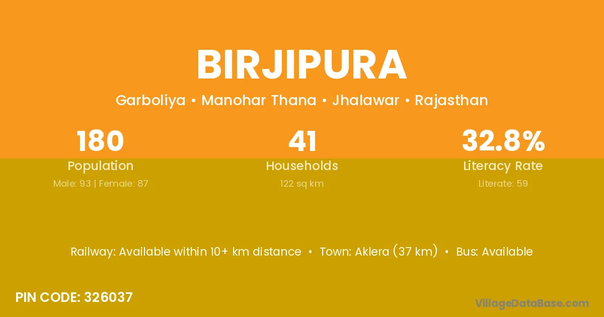 Aklera (37 km) is the nearest town to Birjipura village for major economic activities and is located approximately 37 km away.