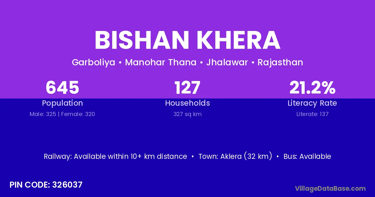 Aklera (32 km) is the nearest town to Bishan Khera village for major economic activities and is located approximately 32 km away.